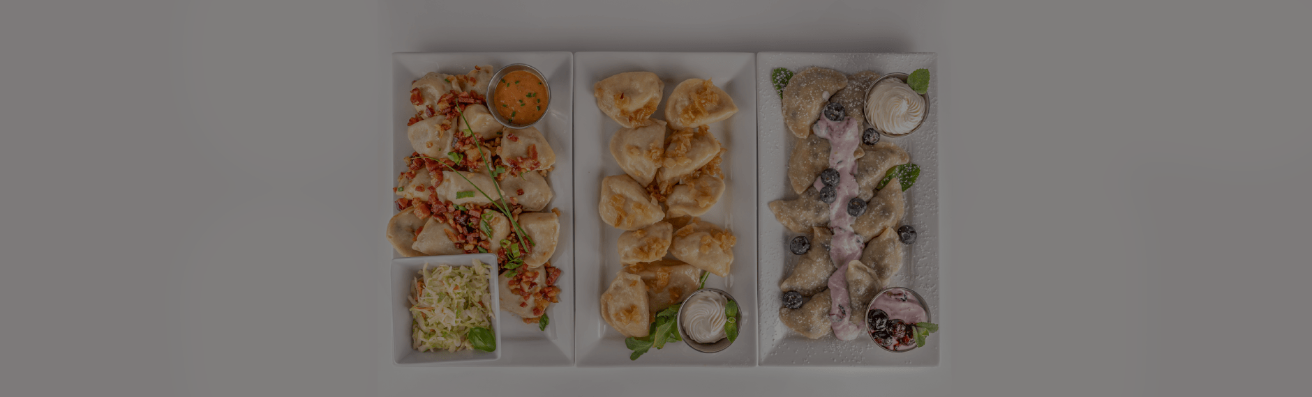 Blueberry pierogi, crafted by hand, in house. Garnished with a wild blueberry compote and a dollop of sweet cream.